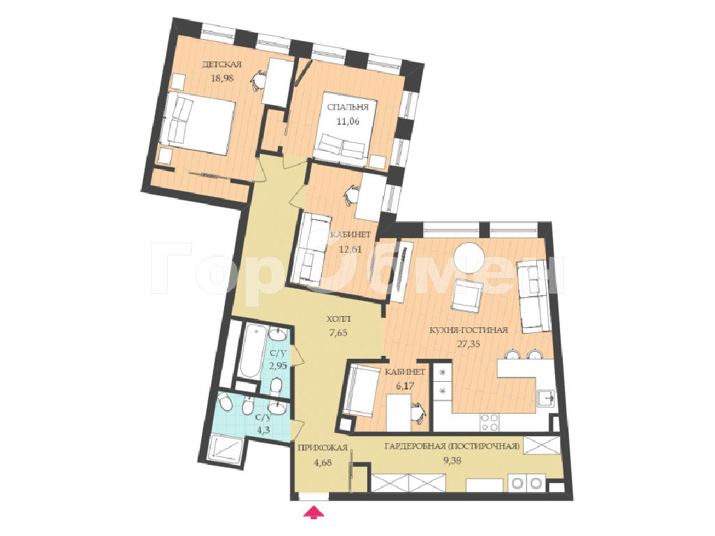 Комнаты: 18.98 13.06 12.61 6.17 м2